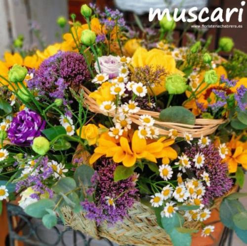 Capazo realizado con eucaliptus y flor de temporada como girasoles, rosas, etc.