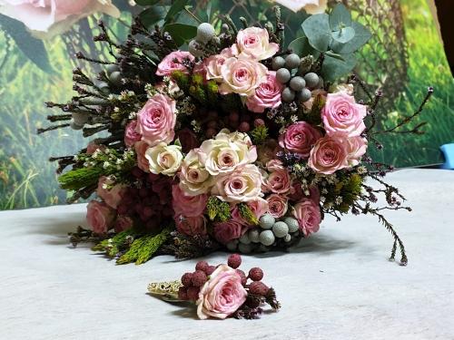 Ramo de novia en rosa y verdes regalo prendidos para el novio y el padrino imantado en flor natural.